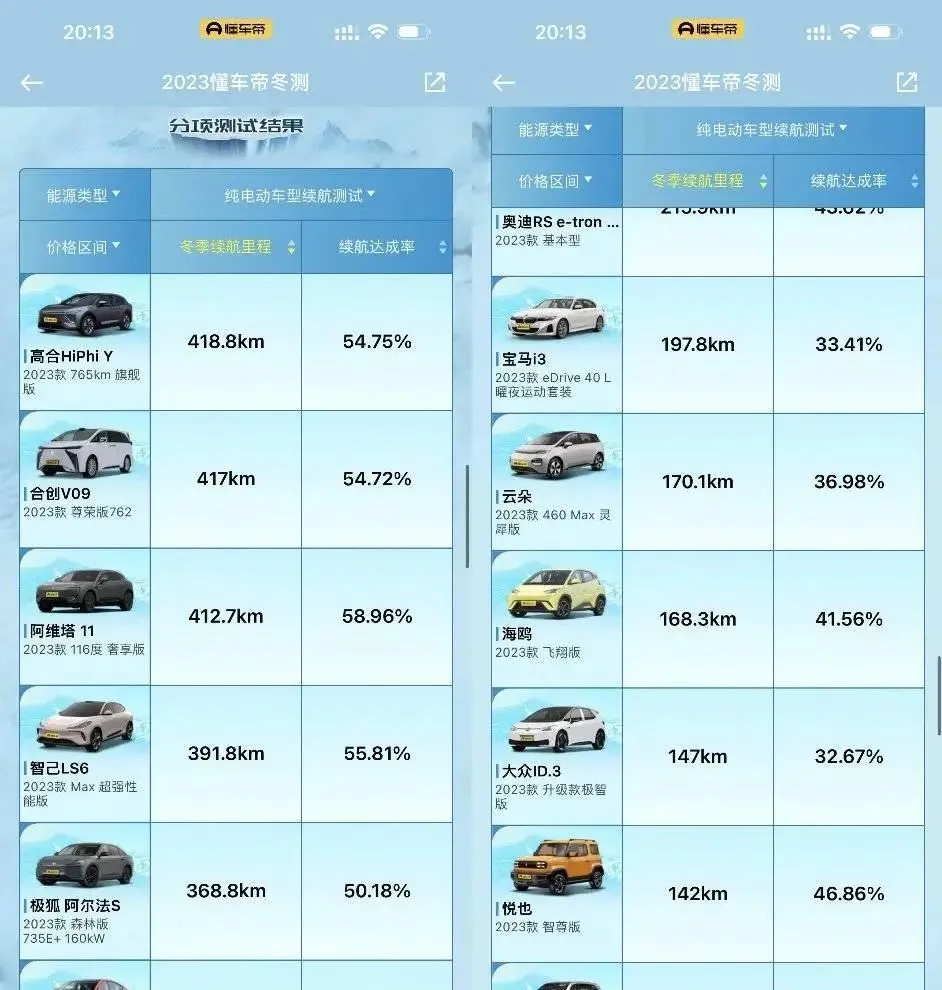 在懂车帝冬测中,34款纯电动车型在零下20度的温度下,平均续航里程仅为292公里。虽然相较于去年冬测的268公里,提升了9%,但官方标注六七百,实际跑出两三百的现实情况,依然无法改变。作为对比,在常温测试只能中,所有49款车平均续航里程却能达到425公里。