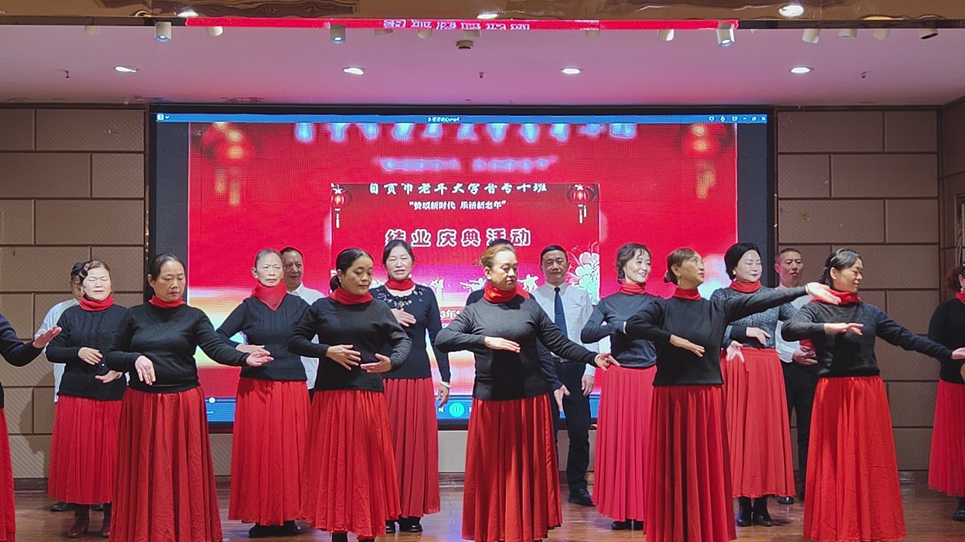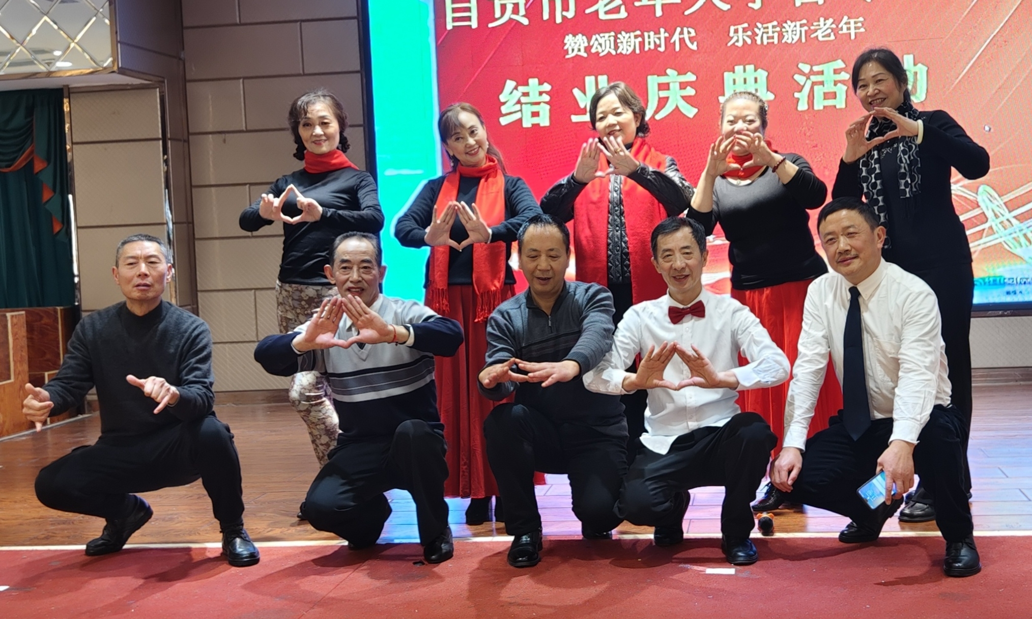 12月27日新年到来之际,自贡老年大学音专十班师生结业庆典活动,在龙湖春天酒店隆重举行,全班师生从大合唱开始,各班组分别表演了精彩的文艺节目,其中还穿挿了有趣的互动活动,使庆典活动达到热闹新髙潮,全体师生在一遍欢乐声中园滿结束。