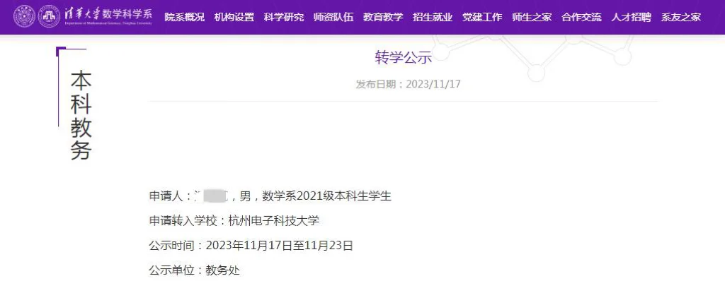 清华大学数学科学系官网关于数学系2021级本科生温某某转学的公示。