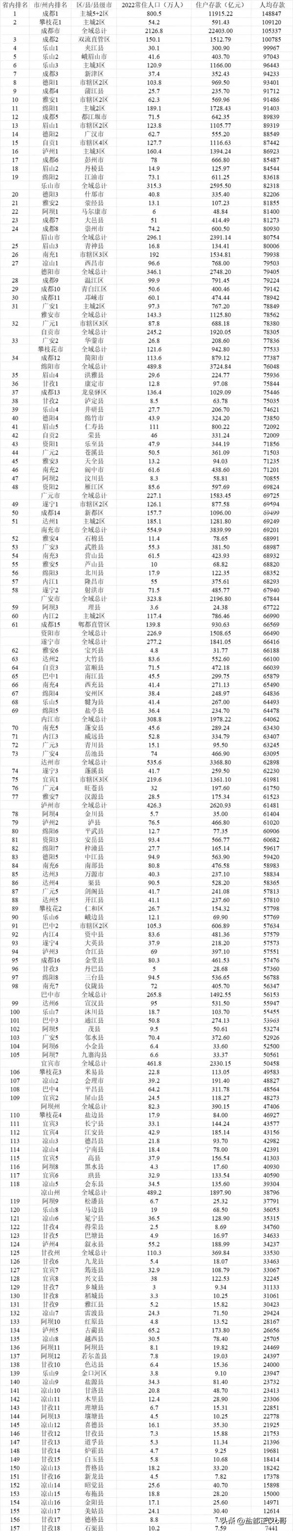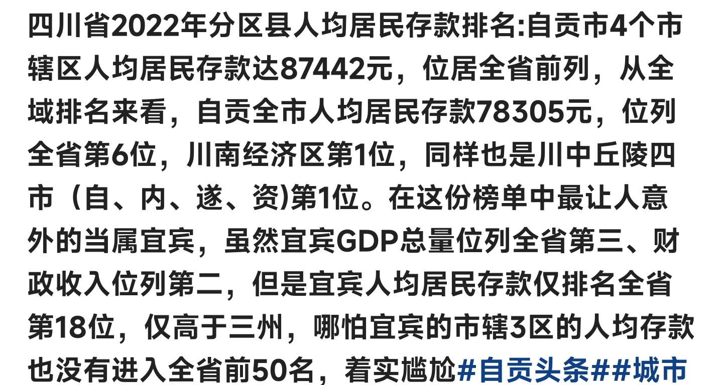 [盐都杂谈] 四川省2022年各区县人均居民存款排名:自贡78305元/人
