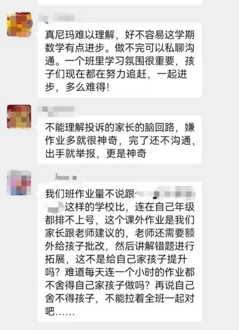 有的家长认为,刘老师布置的作业根本不算多,如果连这点作业都舍不得做,可以单独申请,没必要这样拉着全班同学下水,毕竟其他人还积极要求进步呢。