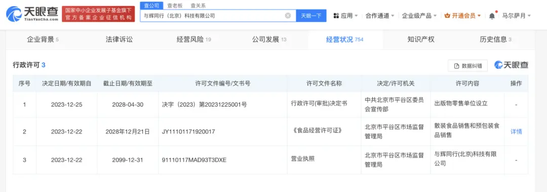 天眼查APP显示,2023年12月25日,与辉同行(北京)科技有限公司新增出版物零售单位设立行政许可,许可机关为中共北京市平谷区委员会宣传部,有效期至2028年4月30日。在此之前,该公司还获得了食品经营许可证,许可内容为散装食品销售和预包装食品销售。