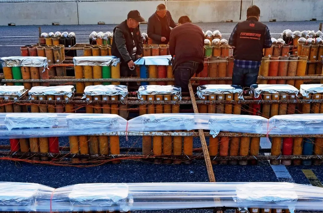 2023年12月29日,福建福州市平潭县,工人安装烟花设备,为跨新年焰火活动做准备。图/视觉中国