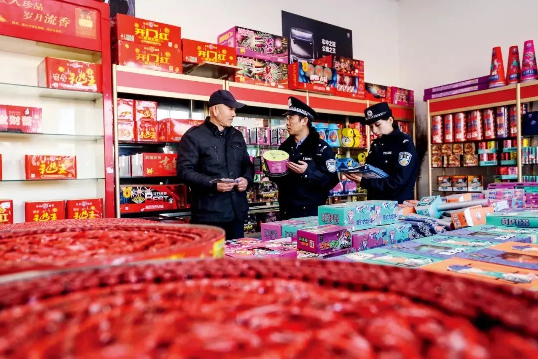 2023年12月26日,甘肃平凉市,派出所民辅警在一家烟花爆竹售卖点开展安全检查。图/中新