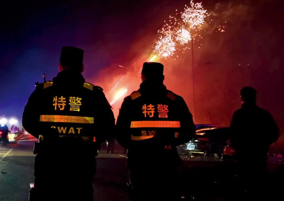 2024年1月1日,安徽马鞍山市当涂县,公安局执勤警力在可燃放烟花区域执勤。图/视觉中国