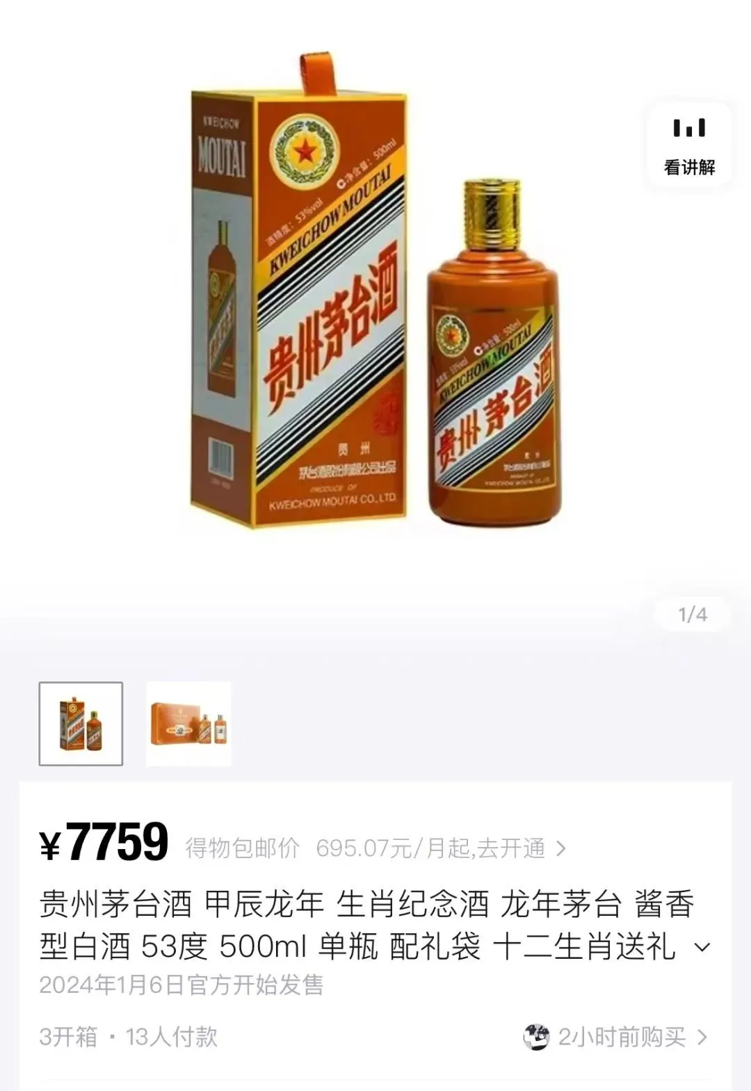 证券时报记者查阅另一第三方平台,显示龙年茅台报价为7759元/瓶,截至目前已有13人付款。