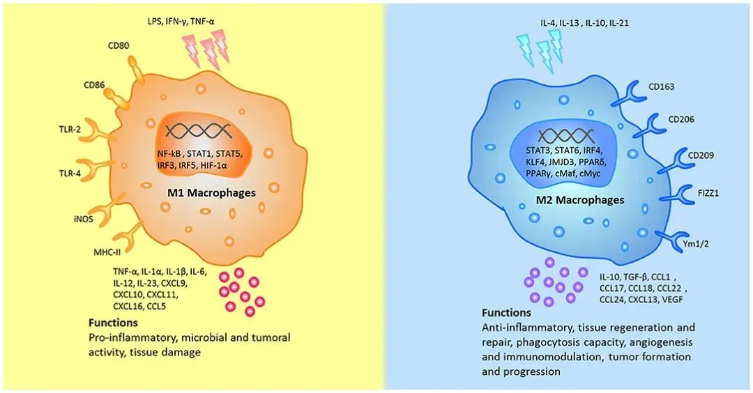 科学家发现巨噬细胞分两种类型:一种促炎(称为M1),一种抗炎(称为M2)。(图片来源:Yongli Yao, Xiang-Hong Xu, Liping Jin via Wikimedia Commons,CC-BY-4.0)