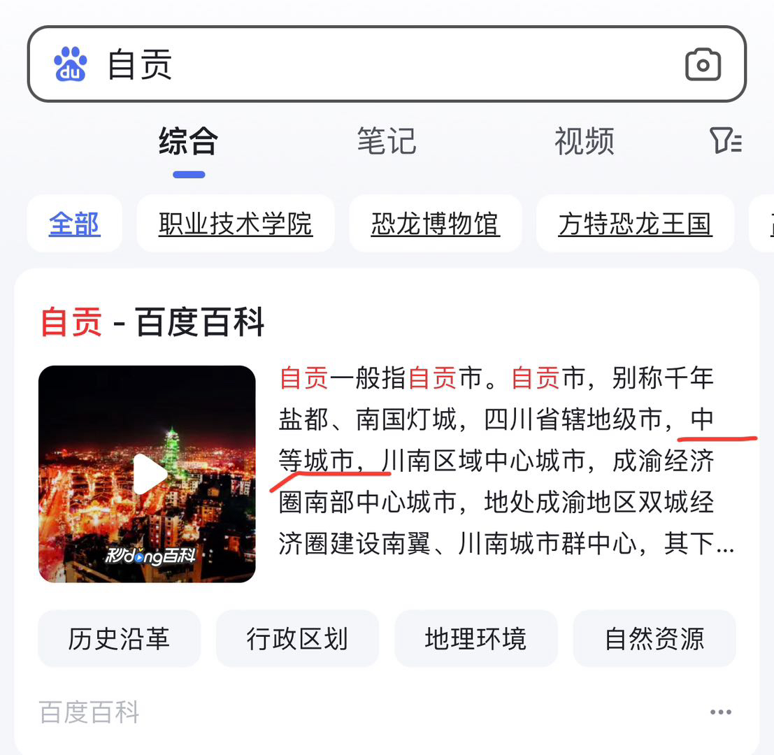 今天看见百度词条把自贡纳入中等城市范畴,具体标准以城区常住人口分段判定,但其他同等级城市并未明显标注,百思不得其解?