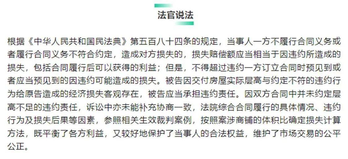 一审法院认为,根据相关规定,层高是指上下两层楼面(未装饰装修之前的混凝土面)结构标高之间的垂直距离。双方一致确认案涉商铺净高为5.6米,原告提供的证据证明楼板厚度为0.12米,故案涉商铺层高为5.72米,不足合同约定的5.8米,被告虽然不予认可,但未能提供反驳证据,应当承担违约责任。