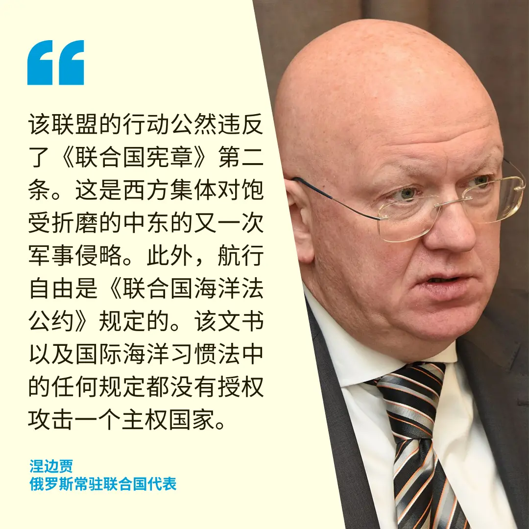 ©联合国图片/Manuel Elias|助理秘书长希亚里发言。 俄罗斯:“国际联盟”的行动应予以谴责 俄罗斯常驻联合国代表涅边贾(Vassily Nebenzia)在安理会发言指出,鉴于本次冲突涉及对另一个国家的公然武装侵略,俄代表团更希望看到联合国秘书长向安理会通报情况。 他说,所谓的“国际联盟”上周四对也门及其人民发动袭击,利用飞机和船只袭击了多个城市,轰炸了城市机场和其他基础设施。 涅边贾表示,美国和英国发动这些大规模袭击与捍卫自卫权无关,自卫权也不能用来保障航行自由。安理会也没有根据《联合国宪章》第七章授权使用武力。