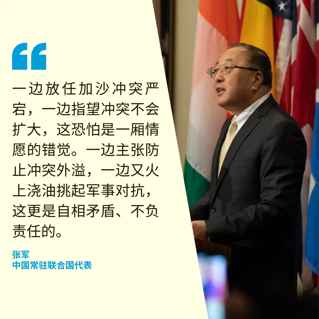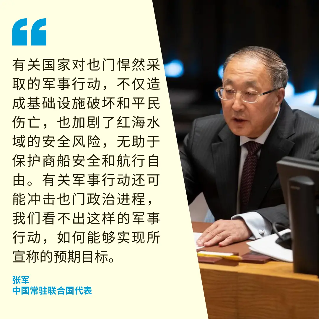 格林菲尔德强调,美国不希望该地区出现更多冲突。她说:“我们的目标很简单:缓和紧张局势,恢复红海稳定,同时维护航行自由的基本原则。” 中国:军事行动无助于保护商船安全和航行自由 中国常驻联合国代表张军表示,美国、英国等国对也门境内目标实施空袭,使红海地区紧张局势进一步升级,中方对此表示严重关切。