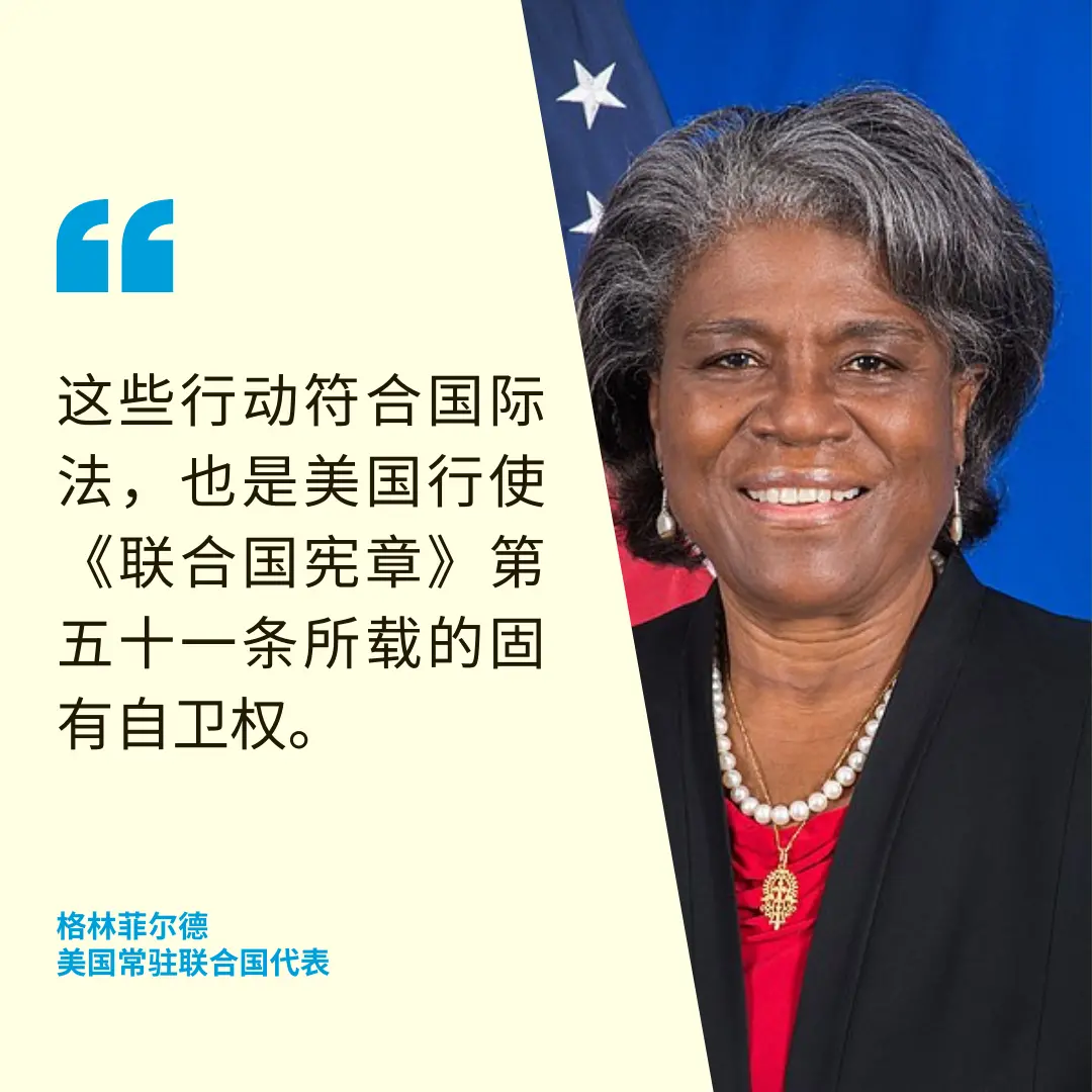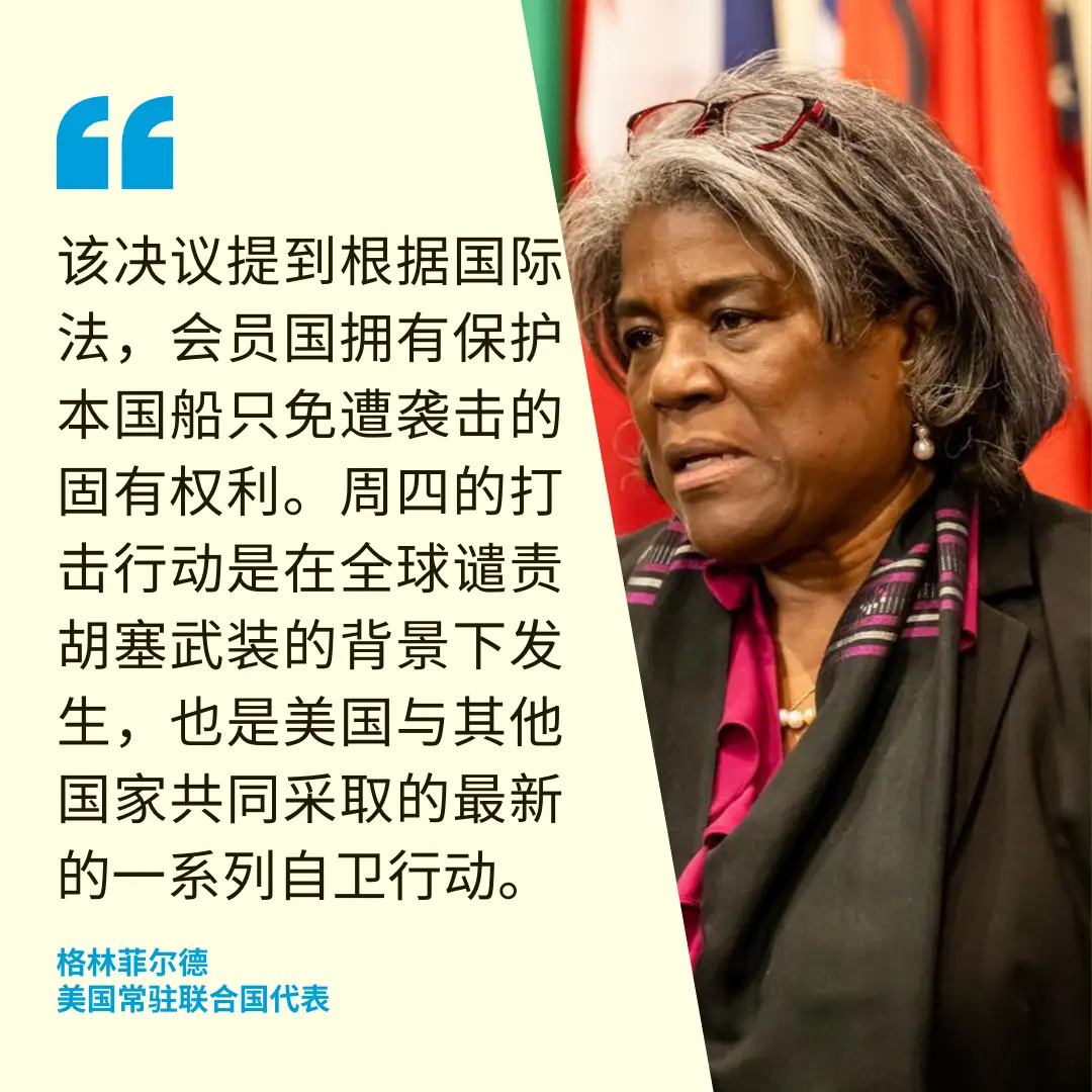 因此,涅边贾认为,应向适当机构提出诉讼以解决争端。他说,俄罗斯一贯呼吁在加沙实现停火,但安理会为此所做的努力多次遭美国阻挠。在安理会讨论红海决议时,俄方预见西方国家会利用模棱两可的案文为其犯罪行为披上合法外衣。俄罗斯因此提出了修正案,但是大多数安理会成员没有决心支持这些建议。 他说,美国及其盟友有着严重违反和歪曲国际法的长期“记录”,但美方还在用“遮羞布”掩盖其在叙利亚的行动。 对于加沙冲突,涅边贾指出,中东目前正面临着严峻的局势。如果局势继续升级,该地区或将遭遇一场灾难,“美国及其帮凶将承担全部责任”。因此,他呼吁国际社会谴责对也门的袭击,并呼吁全世界加紧努力制止中东地区的暴力。 美国:打击胡塞武装是必要且相称的 美国常驻联合国代表格林菲尔德(Linda Thomas-Greenfield)表示,周四晚间对也门胡塞武装目标的打击,是为了破坏和削弱该组织对红海和亚丁湾航运商船发动肆意袭击的能力。她表示,这些打击行动是必要且相称的。