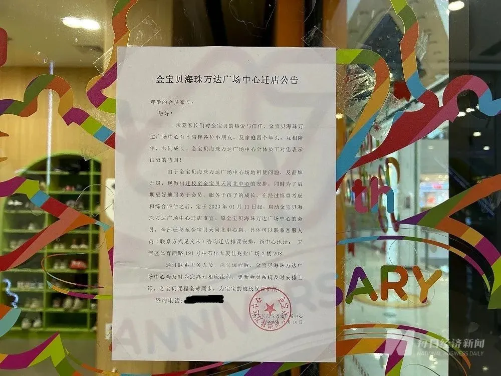 对于金宝贝海珠万达店的客户而言,迁店一事来得太突然。张女士向记者表示,自己的孩子在机构还有六十多节课没有上,如果不是自己碰巧路过门店,看见很多家长围在门口,可能还不知道机构要迁店的事情。“基本上很多家长不知情,昨天(1月13日)下午才出了一个告示贴在店门口”,张女士介绍道。