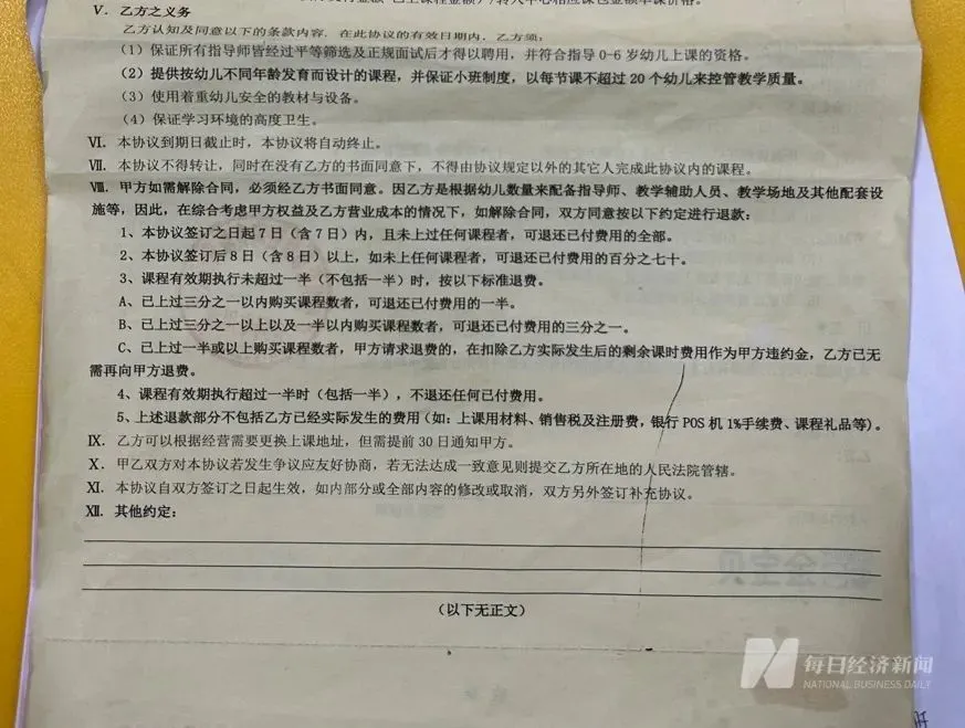 王女士则在2023年9月给自己两岁的孩子报了价格超两万元的课程,当时买了96节课,现在还有近三分之二的课程没上。据她介绍,当时是按照总课时买的,扣除赠送课的附加课时,原定的套餐中还没有上的课程价值17000元左右,她无奈地向记者表示,店家要求按合同退款,“按照合同的条款,我的孩子上了不到三分之一的课程,所以只能退一半的金额,也就是一万元左右。”