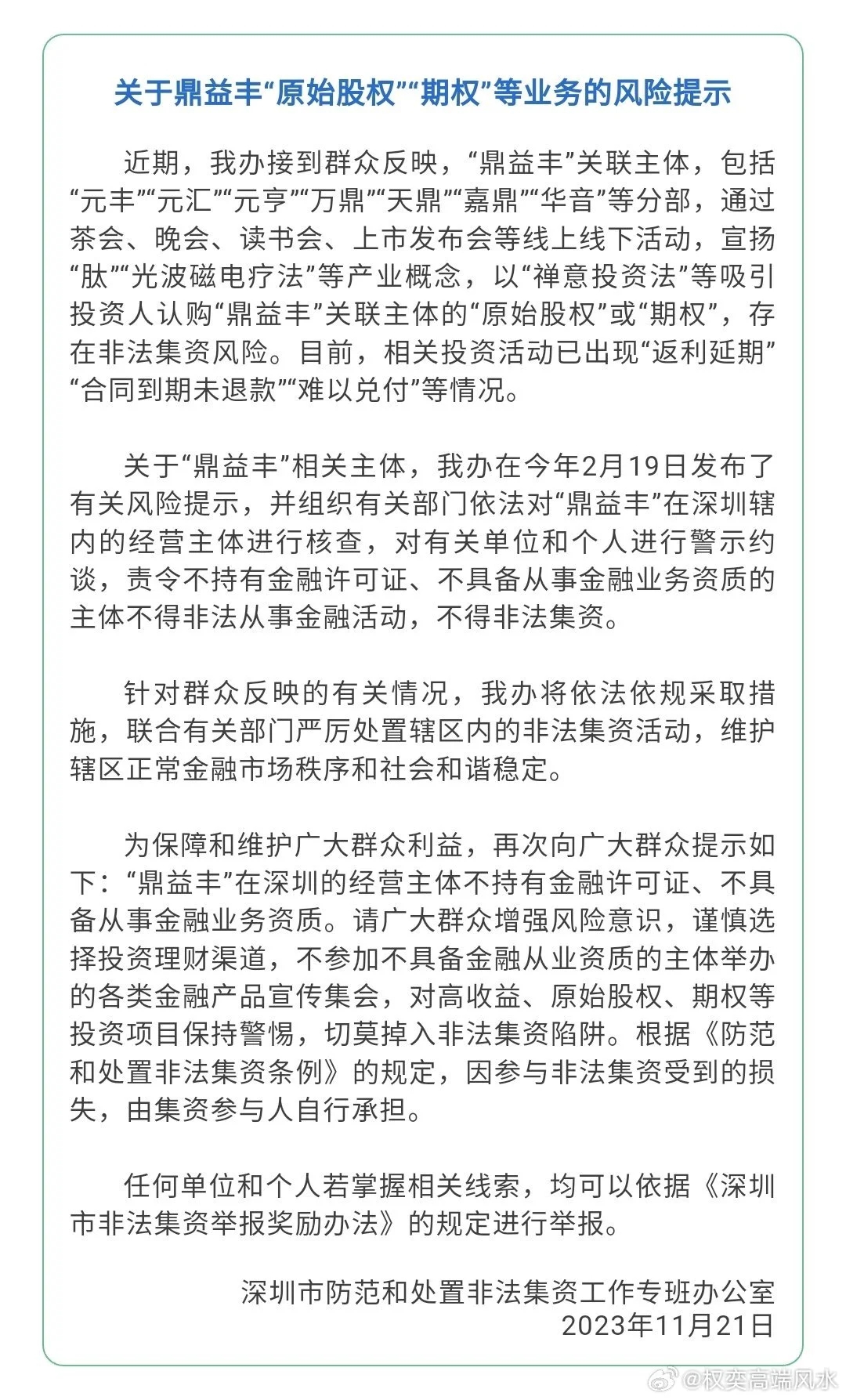大大大,好好好,妙妙妙.....如果不是这个利好通知,我还真不知道深圳有这样一家企业。结果认真看了一下,承包了我一上午的笑点。这不就是个典型的江湖骗子嘛.....图片从卖相到说辞,通通不超过天桥算命打卦的范畴。我看到一位微博网友这样叙述:一位主持人打开音响,晨钟暮鼓声传来,在场的人开始诵读《道德经》。晨会的举办者并不是纯粹的宗教组织,而是一家名为“鼎益丰”公司。