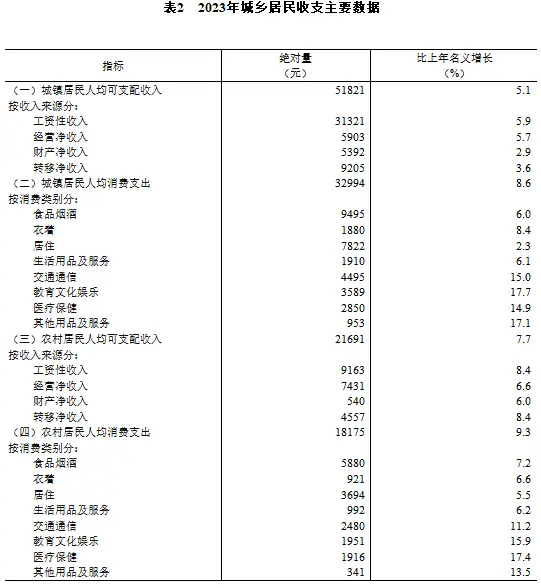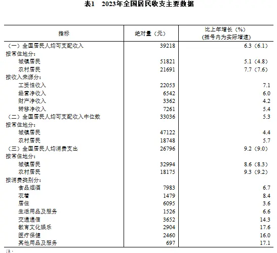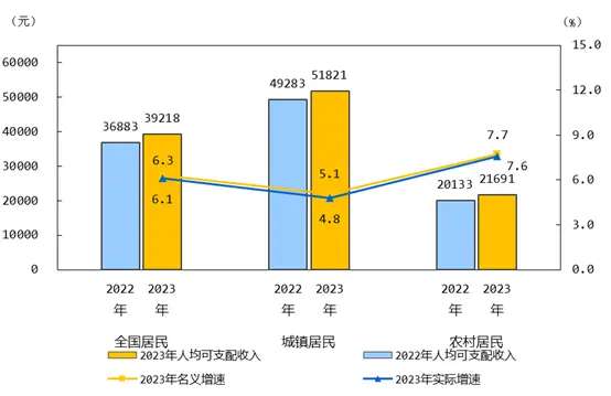 2023年,全国居民人均可支配收入39218元,比上年名义增长6.3%,扣除价格因素,实际增长6.1%。分城乡看,城镇居民人均可支配收入51821元,增长(以下如无特别说明,均为同比名义增长)5.1%,扣除价格因素,实际增长4.8%;农村居民人均可支配收入21691元,增长7.7%,扣除价格因素,实际增长7.6%。