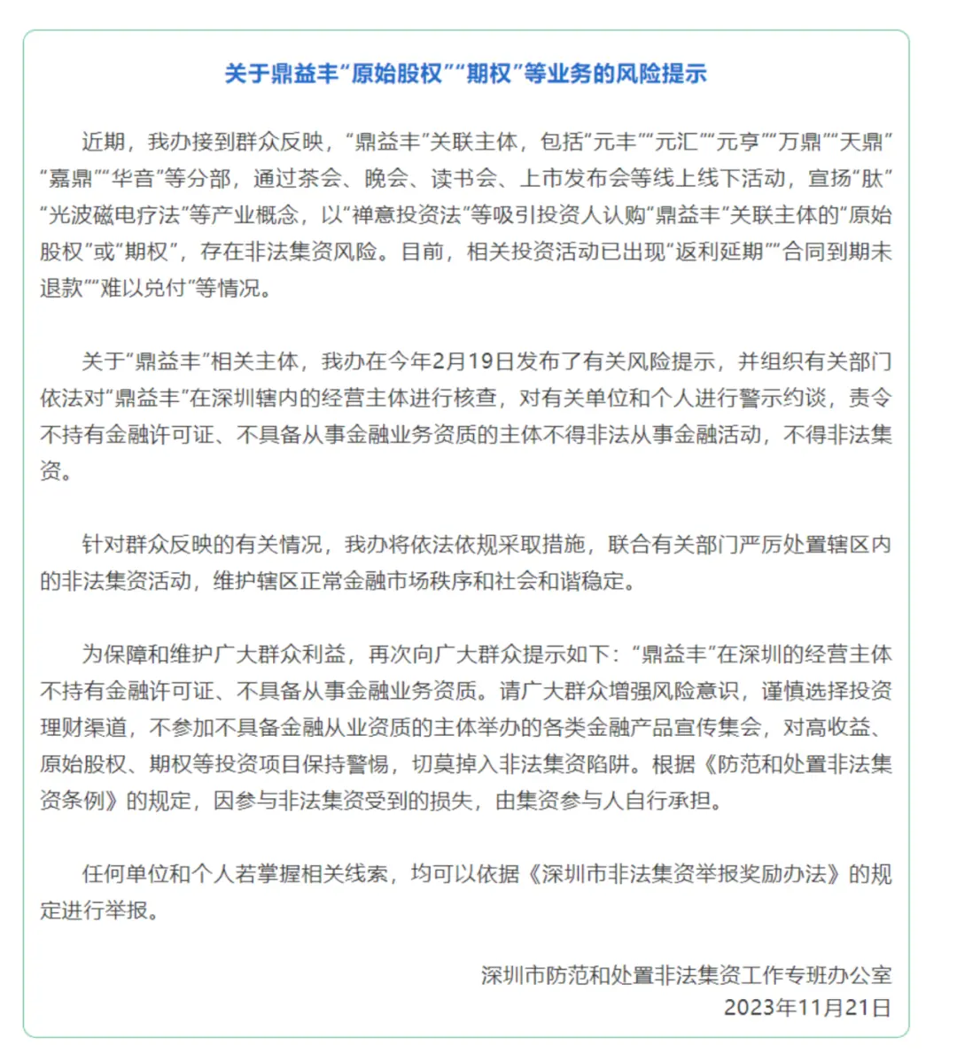 此前2023年,深圳市防范和处置非法集资工作专班办公室已经两次对鼎益丰相关业务进行过风险提示,“以‘禅意投资法’等吸引投资人认购‘鼎益丰’关联主体的‘原始股权’或‘期权’,存在非法集资风险。目前,相关投资活动已出现‘返利延期’‘合同到期未退款’‘难以兑付’等情况。”