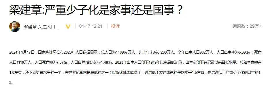 著名人口专家梁建章发文称,2023年出生人口创下1949年以来最低纪录,出生率创下有记录以来最低水平。总和生育率在1.0左右,还不到更替水平的一半,在世界范围内是最低的之一(仅仅比韩国略高),远远低于发达国家的平均水平1.5左右,也远远低于严重少子化的日本的1.3。