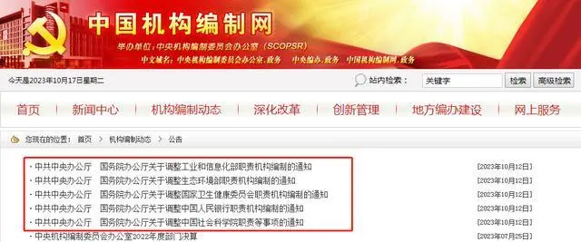 中国机构编织网信息显示,2023年10月12日,中央一连发布5则通知,涉及工信部、生态环境部、央行、社科院和卫健委五大部门,其中央行有30个行政编制和6名局级领导职位被核减。