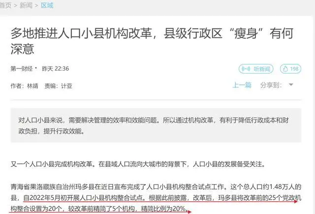 青海玛多县,一个人口仅有1.5万的小县城,1年时间将25个党政机关缩减了5个,20%的铁饭碗被砸碎。