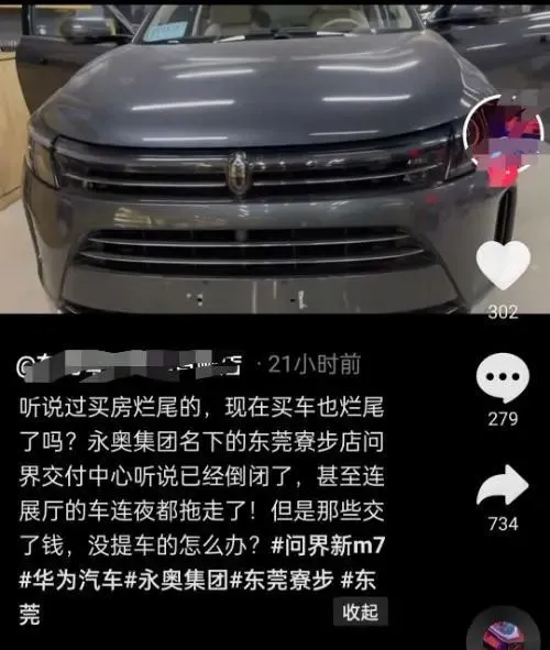 1月17日晚,有网民在社交媒体平台上发布视频并配文称:“现在买车也烂尾了吗?永奥集团名下的东莞寮步店问界交付中心听说已经倒闭了,甚至连展厅的车连夜都拖走了!但是那些交了钱,没提车的怎么办?”这条视频引起热议。