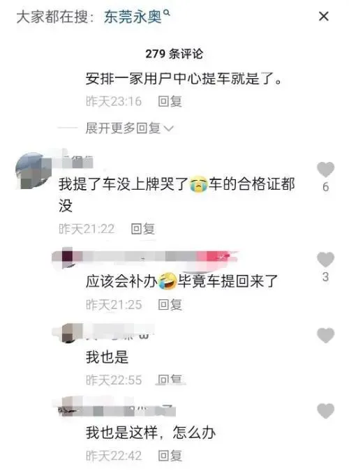 随着广东永奥“爆雷”消息的不胫而走,越来越多的员工、消费者正通过短视频、社交媒体等渠道曝光自身遭遇。有用户表示被永奥拖欠了5个月的工资,也有消费者发文求助称:“我提车了,没上牌,塘厦永轩的,怎么办?”
