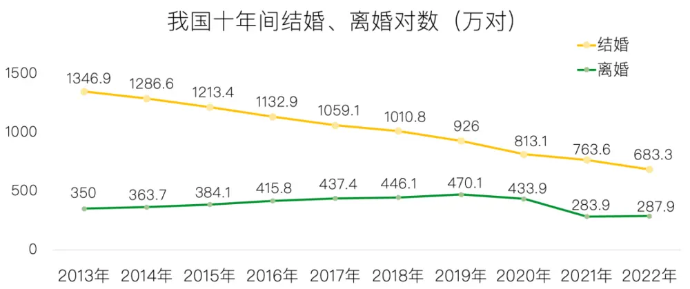 2013年有1346.9万对男女结婚,而到了2022年,只有683.3万对,下降了50%!而离婚的人数变化幅度则很小。