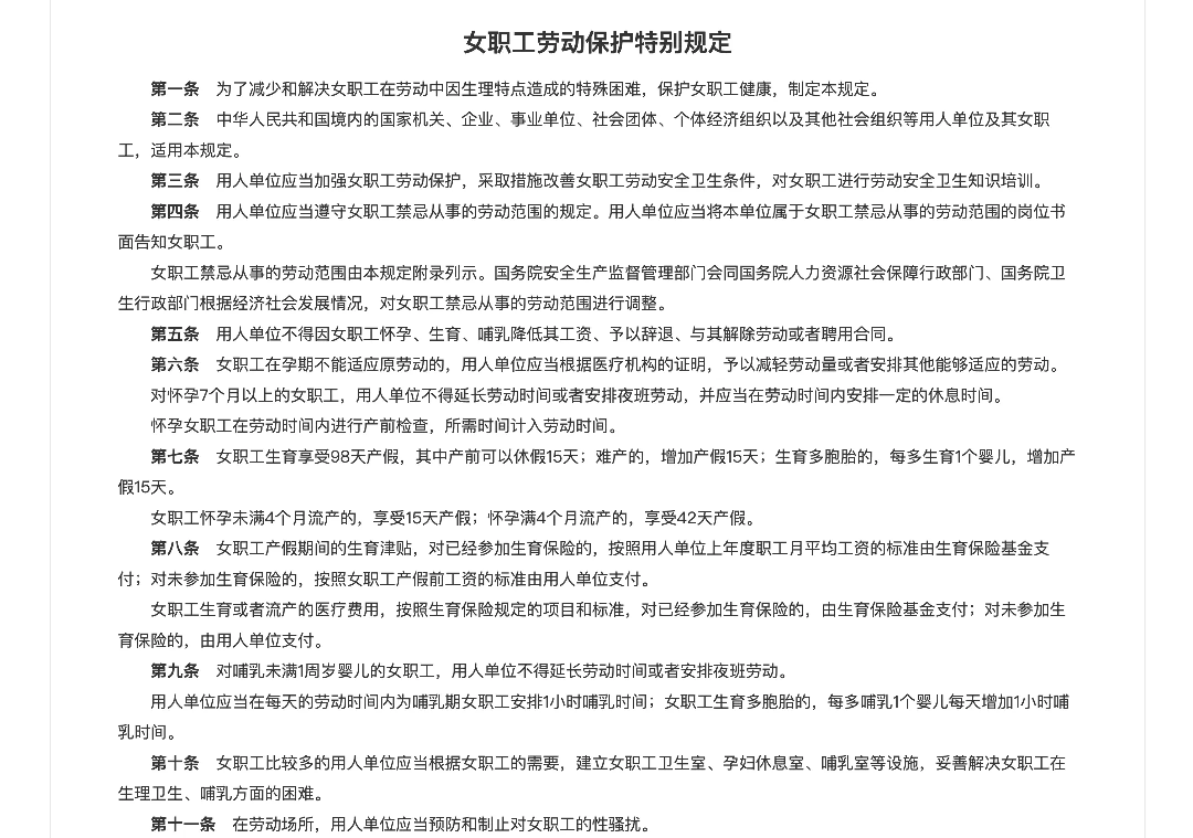▲国务院《女职工劳动保护特别规定》第五条规定,“用人单位不得因女职工怀孕、生育、哺乳降低其工资、予以辞退、与其解除劳动或者聘用合同。”(图源:中华人民共和国中央人民政府官网)