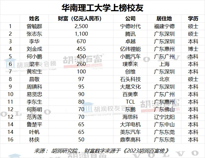 具体到华南理工大学,一共有16位校友登上2023胡润百富榜。