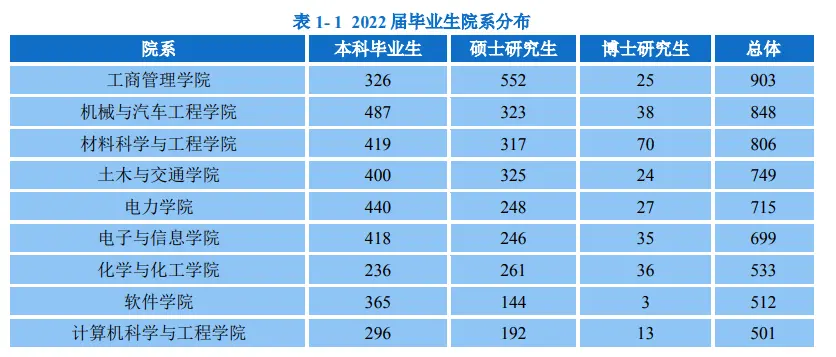 就拿2022届的毕业生来说,毕业生数量排名前9的学院,除了工商管理学院(仍然偏重应用),其他8个都是理工类的,像机械与汽车工程学院、材料科学与工程学院、土木与交通学院等等。