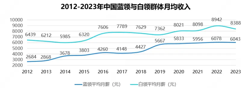 过去十年,蓝领群体平均月收入显著提升,由2012年的2684元增至2023年的6043元,是原来的2.26倍,与白领群体的平均月薪相比,二者的差距逐渐减小。