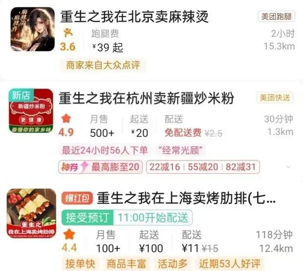 家境显赫的主理人被诡计多端的奸人暗算,来世复仇的秘诀就藏在炒勺里。甚至“重生之我在北京卖麻辣烫”的老板真的写出了重生爽文的故事卡牌,每章节卡片随外卖送出。