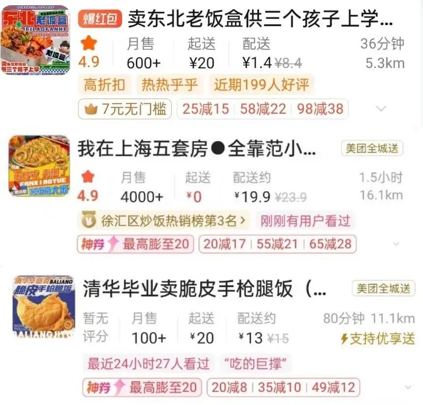加盟商学会运营套路后可能会自立门户,而品牌方的外卖项目也可能不断变换:“重生之卤肉饭”卖不动时,“卖炒饭赚彩礼”系列就上架了,几个月后很可能又改成了“卖鸡腿饭养孩子”店铺。