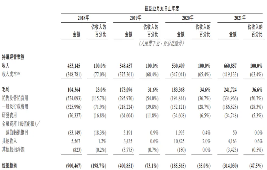 对应2018-2021年,快狗打车的销售及营销费用分别为5.24亿元、2.96亿元、1.95亿元、3.35亿元,分别占收入的115.7%、54%、36.7%、50.7%。