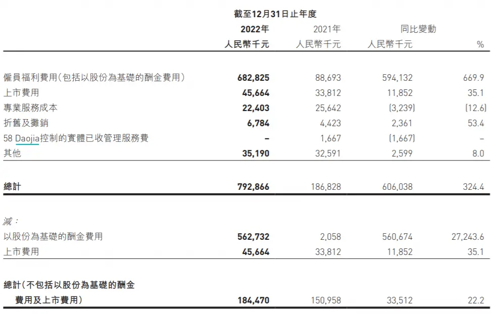 快狗打车在2022年年报中表示,期内雇员福利费用增加5.94亿元导致了一般及行政费用的高增长。