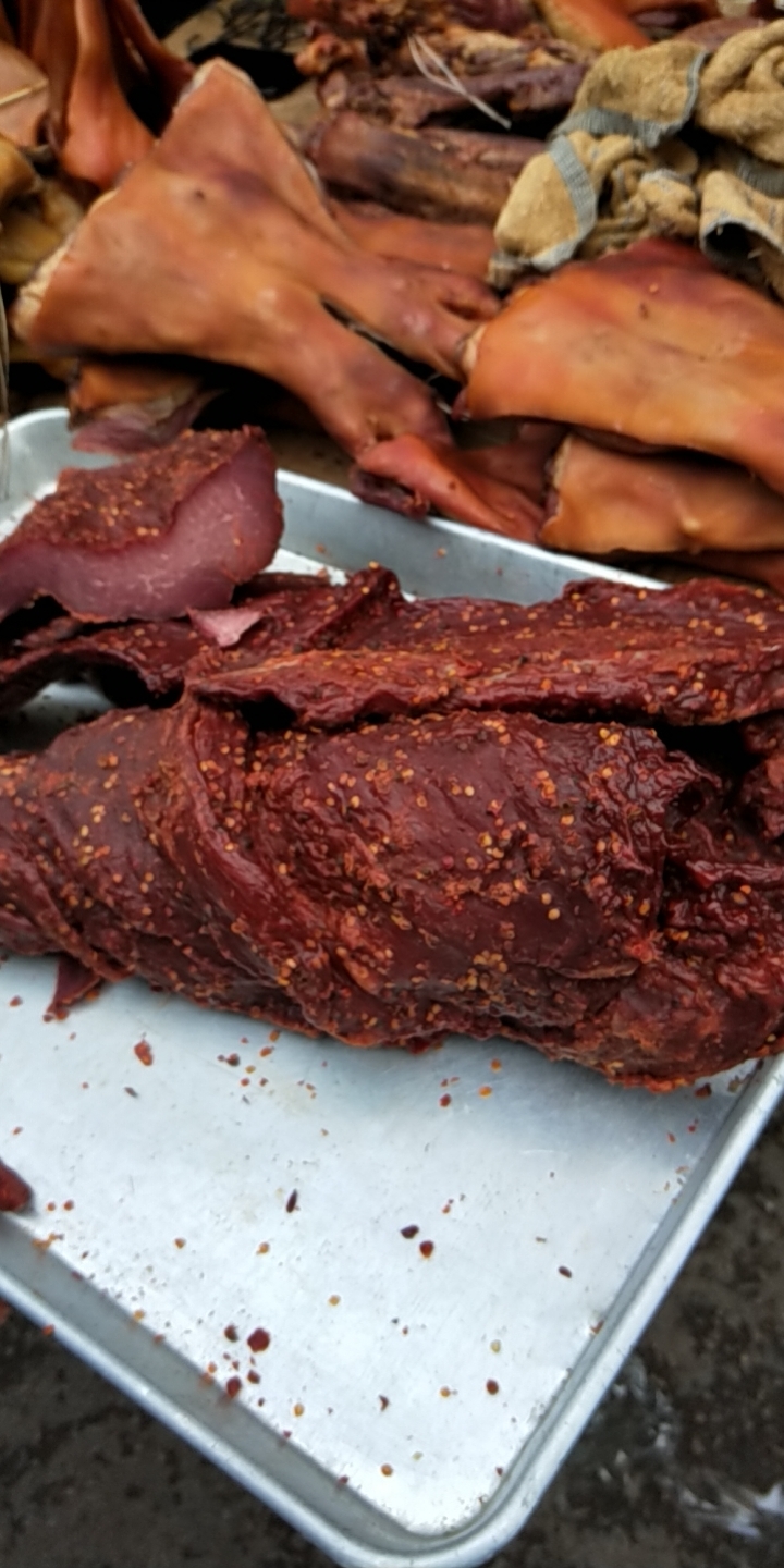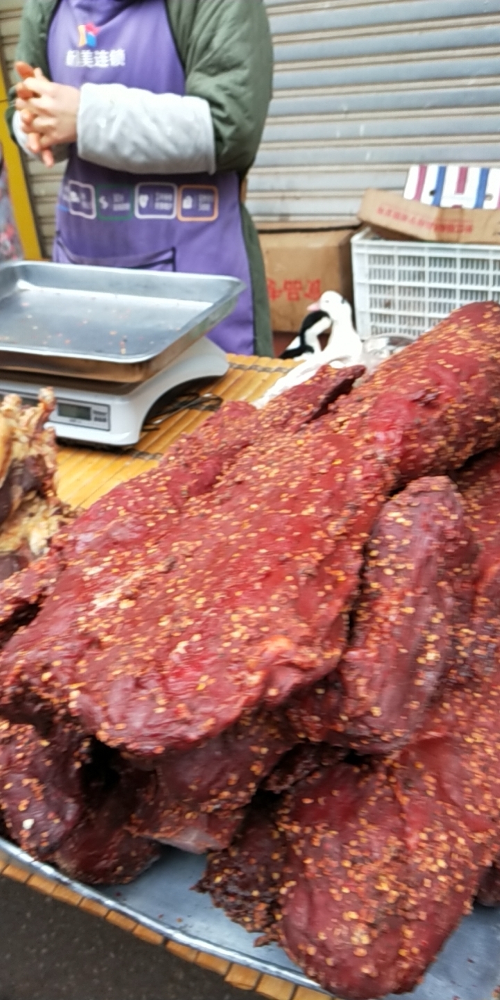 目前,市场上的腌腊食品铺上随处均见酱牛肉。这些酱牛肉青一色来自人造牛肉。图片来自贡井区五宝镇农贸市场。