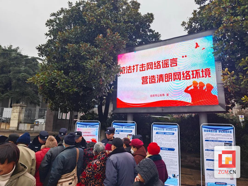 1月23日,荣县县委网信办、公安局联合网络大V“蜀中桃子姐”共同发布“抵制网络谣言,携手营造清朗网络环境”宣传视频,呼吁广大网民明辨是非,共同守护网络法治,维护社会和谐。 深入学校、街面开展宣传活动  1月12日,贡井公安分局在田家炳中学以典型生动的案例为师生们讲授了一堂“共同守护清朗网络空间,打击网络谣言从我做起”的主题课。  1月15日,沿滩公安分局深入社区街面,通过发放宣传资料、展示相关案例、与群众互动等形式,向过往群众普及如何辨别网络谣言、传播网络谣言的危害和后果,倡导群众自觉抵制、举报网络谣言,共建清朗网络空间。 利用LED显示屏助推宣传质效 充分利用辖区LED显示屏,在人流量集中的商场、街区滚动播放“依法严厉打击网络谣言,维护清朗和谐网络环境”宣传标语,提醒群众文明上网、理性发言,共同营造清朗和谐的网络环境。      自贡市将加大对网络谣言的打击整治力度,搭建起政府部门、互联网企业、广大网民共同参与的辟谣体系和传播矩阵,进一步提升网络谣言治理水平,共同营造清朗和谐、风清气正的网络环境。
