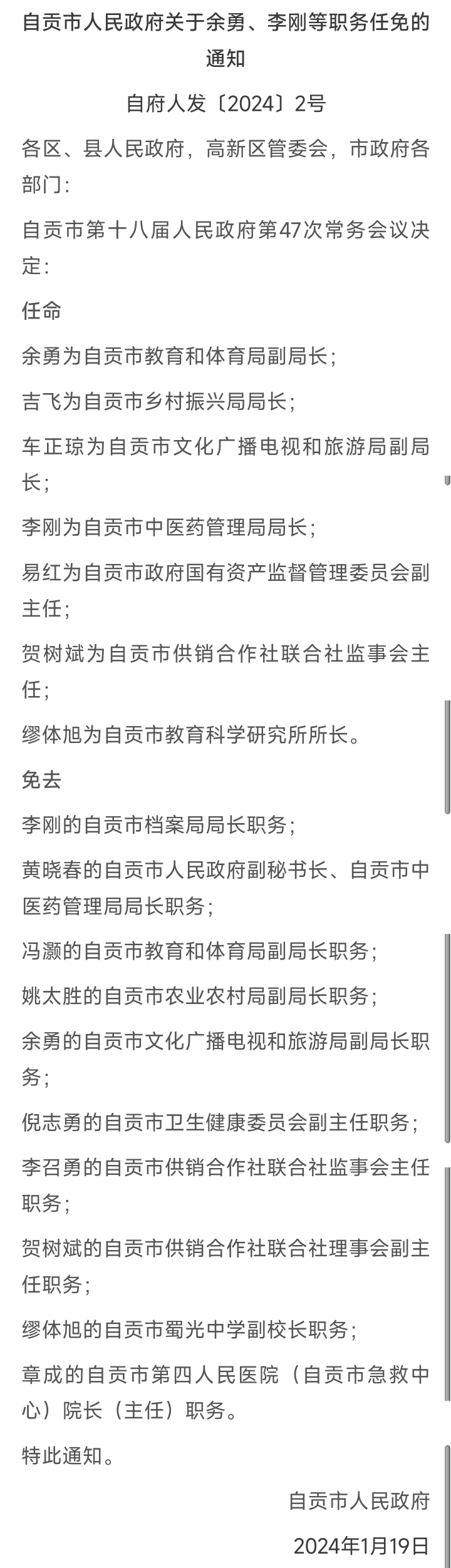 自贡市人民政府关于于余勇、李刚等职务任免的通知