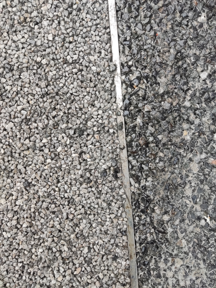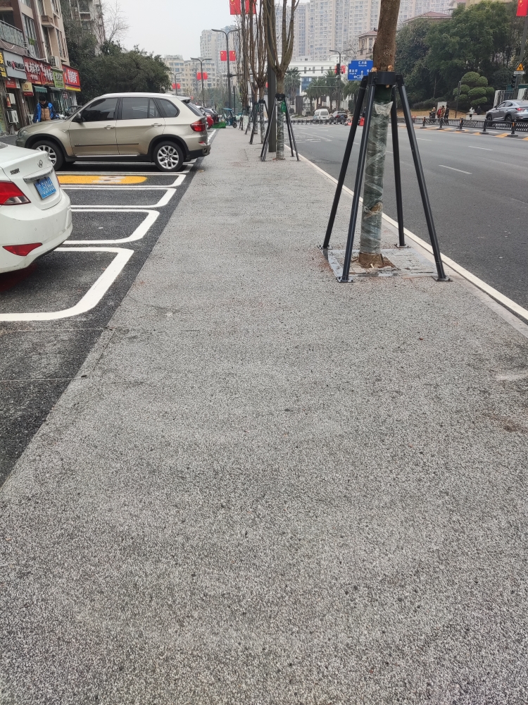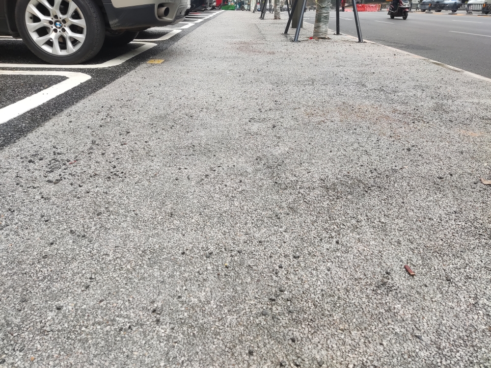 刚刚弄好的人行道路面这种石子到处都是,并且旁边停了汽车,轮胎压住这样的小石子飞起来很危险的。