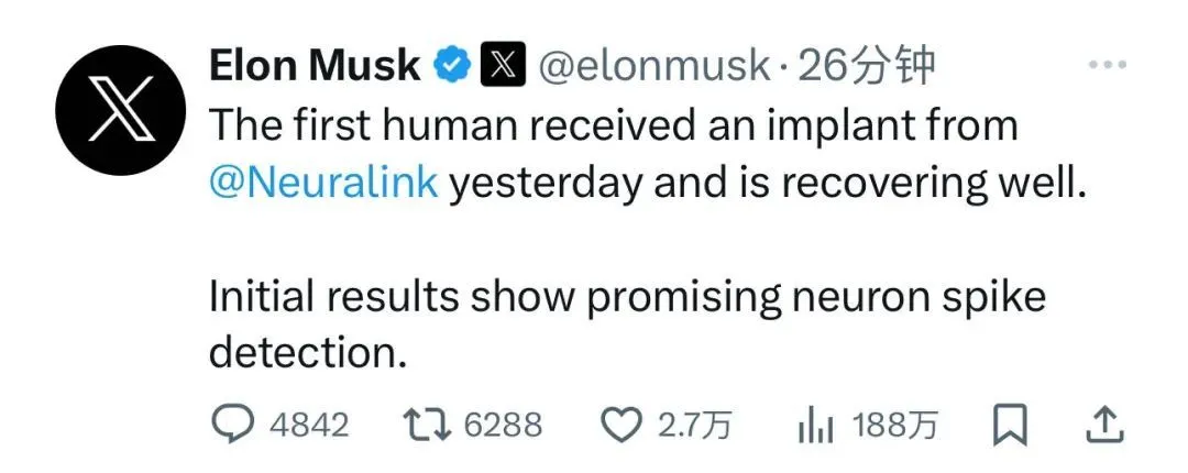 Neuralink创始人埃隆·马斯克刚刚在社交媒体平台X上宣布,在昨天,人类首次接受脑机接口(Neuralink)芯片植入,植入者恢复良好。