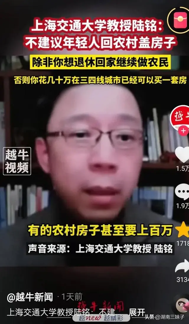 近日,一段关于上海交通大学教授陆铭,在谈及给到年轻人建议的话题中,他说:“不建议年轻人回农村盖房子,除非你想退休回家继续做农民。否则,你花几十万在三四线城市已经可以买一套房了。”