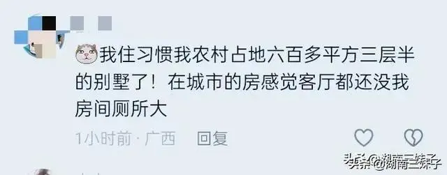 有网友说:“我住习惯了农村占地六百多平方三层半别墅了!在城市感觉客厅都还没有房间厕所大!”