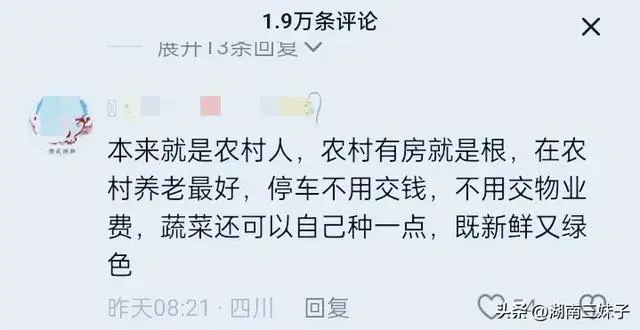 有网友说“本来就是农村人,农村有房就是根,在农村养老最好,停车不用交钱,不用交物业费,蔬菜还可以自己种一点,既新鲜又绿色。”