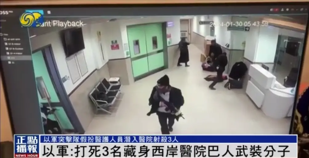 路透社取得的监控视频画面显示,参与这次行动的以军突击队员共计十多人,3人身穿女装,2人打扮成医护人员,画面中的突击队员手持**穿过走廊。