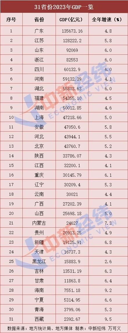 随着新疆于1月31日发布2023年国民经济运行情况,31省份2023年地区生产总值(GDP)数据已全部出炉。总量方面,广东连续35年全国居首;增速方面,17省份跑赢“全国线”,西藏增速第一,达到9.5%。
