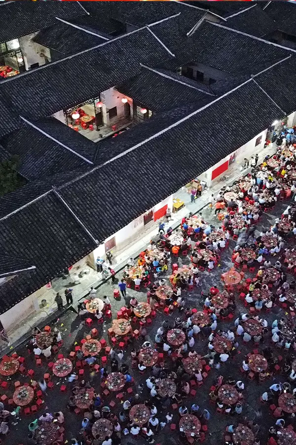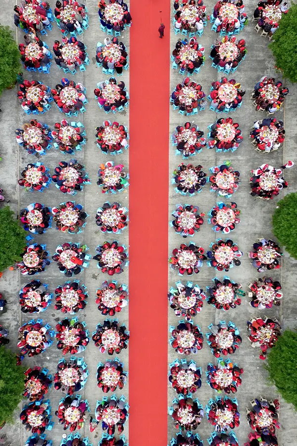 大席如此之好,如今甚至有许多城里的年轻人,把吃大席当作旅行目的地之一。城里明明有更高级的餐厅,更体面的酒楼,为何人们依然爱露天大席?可能除了几百元就能上十几道菜的超高性价比,更是因为在大席上,你能看到中国人最真诚热闹的一面。