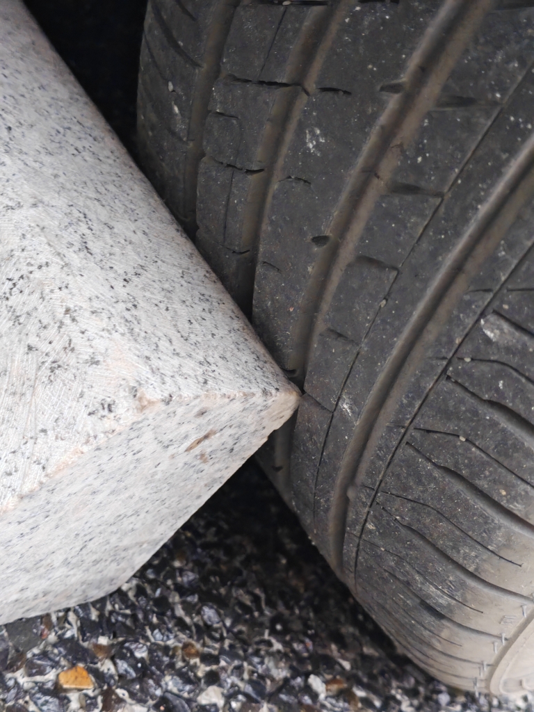 停车时如果角度斜倒入车位,这个坚硬的花岗石直角就有可能将车轮戳破,这么大的工程交给哪些非专业人士处理的啊?