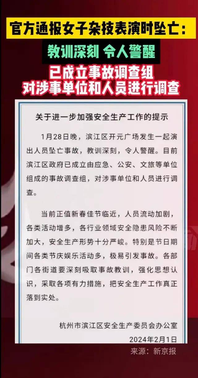 令人痛心的是,事发之后,官方也通报了此次事故,确认了女演员不幸坠亡,在通告中,归其负责的杭州滨江区安全生产委员会也表示已经成立事故调查组,将对涉事单位和人员进行调查。