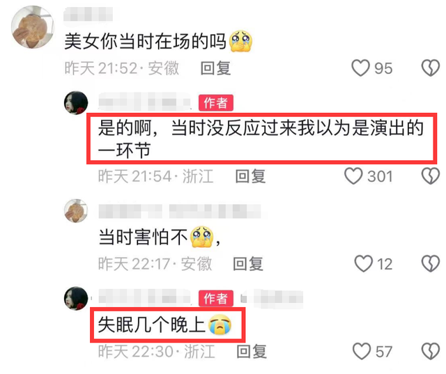 通过目击者的发声可以得知,当时女演员掉下来后,一些观众还以为是特效表演,是预先设定好的节目环节,当得知是意外掉落后,真的被吓懵了,这位目击者因此失眠了好几个晚上。