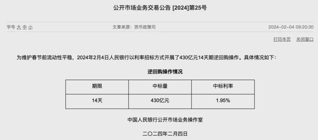 2月4日,央行也有大动作。据央行官网显示,为维护春节前流动性平稳,人民银行当日以利率招标方式开展了430亿元14天期逆回购操作,中标利率为1.95%。Wind数据显示,当日无逆回购到期,因此单日净投放430亿元。
